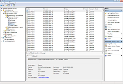 - Cliccare sul pulsante Start, quindi andare nel Pannello di controllo, scegliere Strumenti di amministrazione, ed infine doppio clic su Visualizzatore eventi.