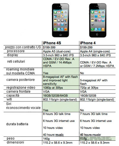 Differenze così marcate come tra l’iPhone 3GS e tra l’iPhone 4, l’iPhone 4S non ne presenta. Gli unici sostanziali cambiamenti degni di rilevanza sono il processore aggiornato, una migliore velocità di connessione, una fotocamera migliorata e la capacità di ospitare memorie fino a 64 GB. In poche parole, l’iPhone 4S è semplicemente un iPhone 4 “aggiornato”.