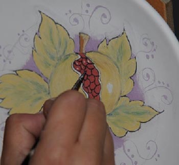 ▬ La pittura tradizionale: per utilizzare la tecnica di pittura tradizionale, si fa uso di carta carbone per riportare sul supporto il motivo scelto, poi si mescolano liberamente le tinte su un piattino e si applicano con il pennello.