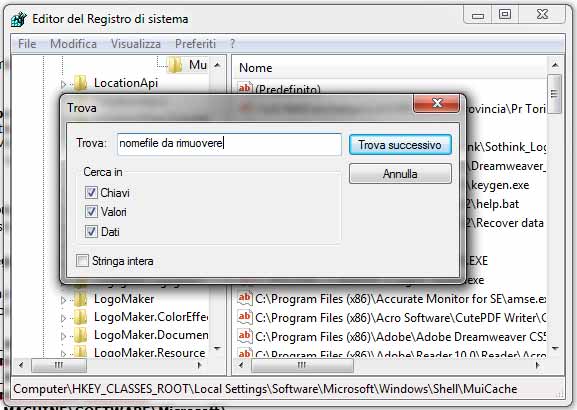Eliminare i programmi che partono automaticamente all'avvio di windows 7 cancellando la chiave di registro