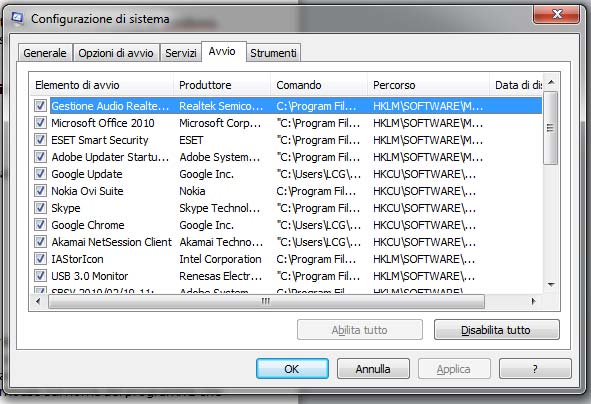 E bene ricordare che per velocizzare windows è opportuno che i programmi lanciati automaticamente ad ogni avvio di windows siano il meno possibile, dunque scegliete di lasciare solo quelli più importanti o indispensabili, in fondo se un programma vi serve lo potete sempre avviare successivamente in qualunque momento.