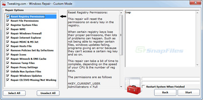 Ecco una lista sulle possibili voci che si possono controllare con il programma Windows Repair: