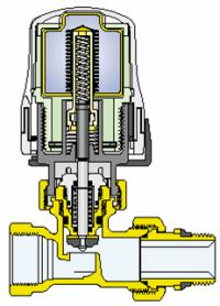 La valvola termostatica, altrimenti detta anche regolatore di temperatura, si aziona grazie ad un contenitore di cera che si dilata al variare della temperatura.